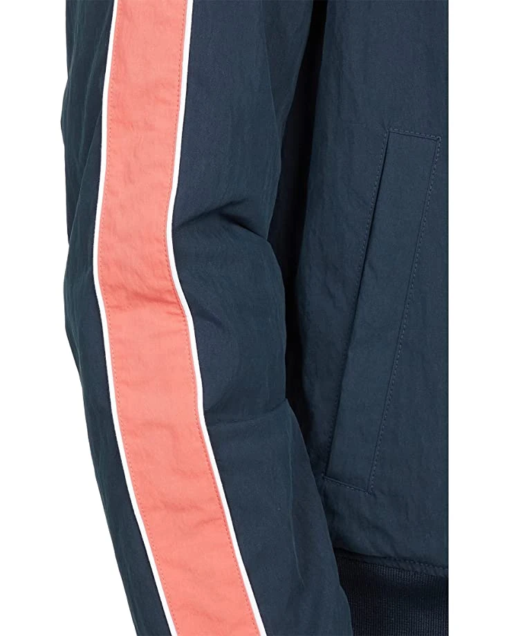 - Sporty striped accent on the long sleeves with elasticized cuffs.